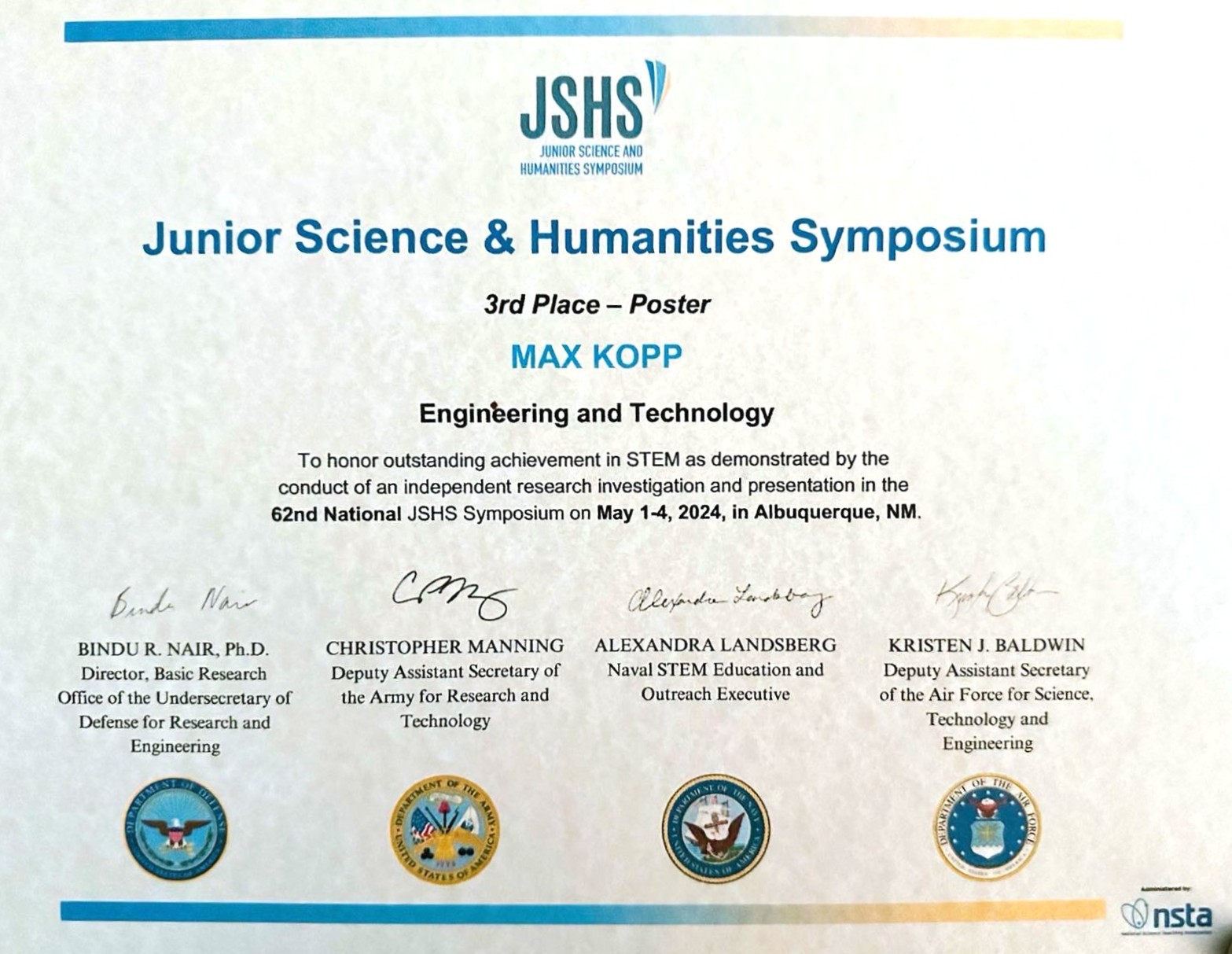 Awarded to Max Kopp for his exceptional poster presentation in the Engineering and Technology category. This prestigious national recognition honors innovative scientific research, technical excellence, and outstanding communication skills, showcasing projects with significant real-world impact. The award reflects Max’s commitment to advancing engineering solutions through rigorous research and creative problem-solving at the NJSHS, sponsored by the National Science Teaching Association (NSTA).
