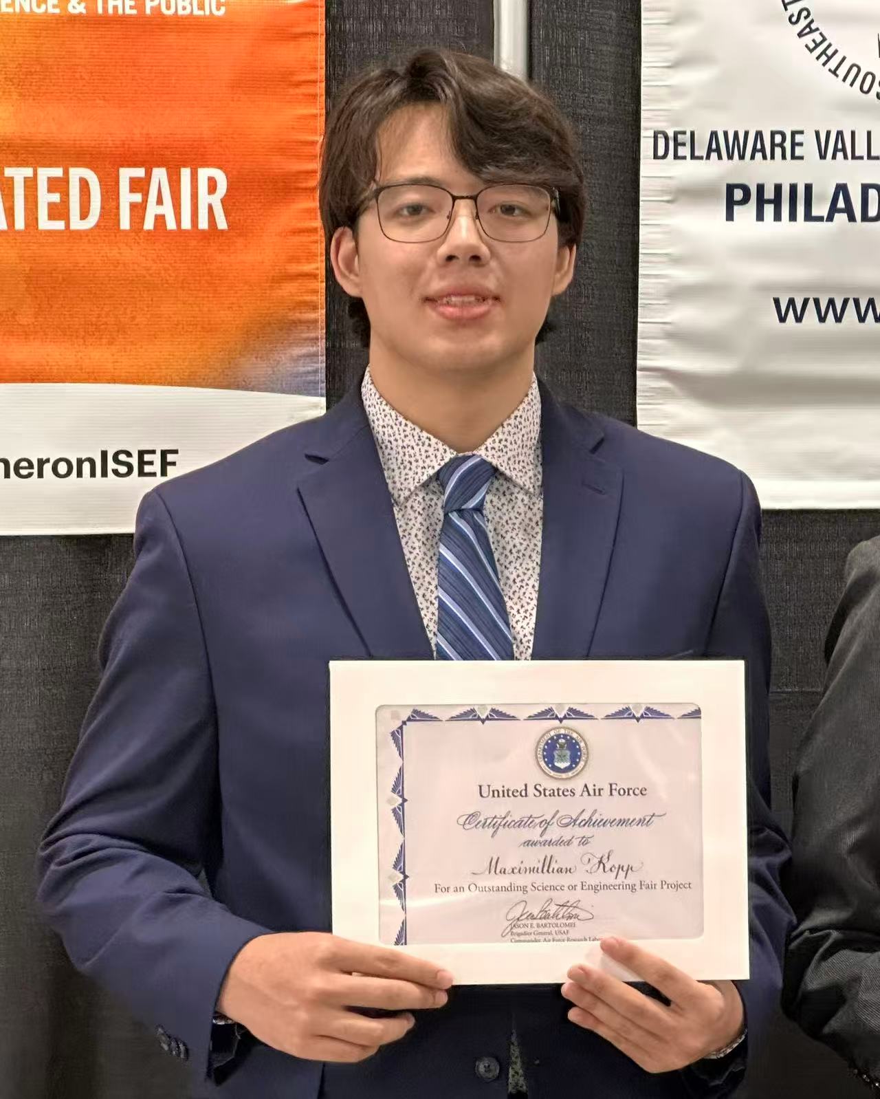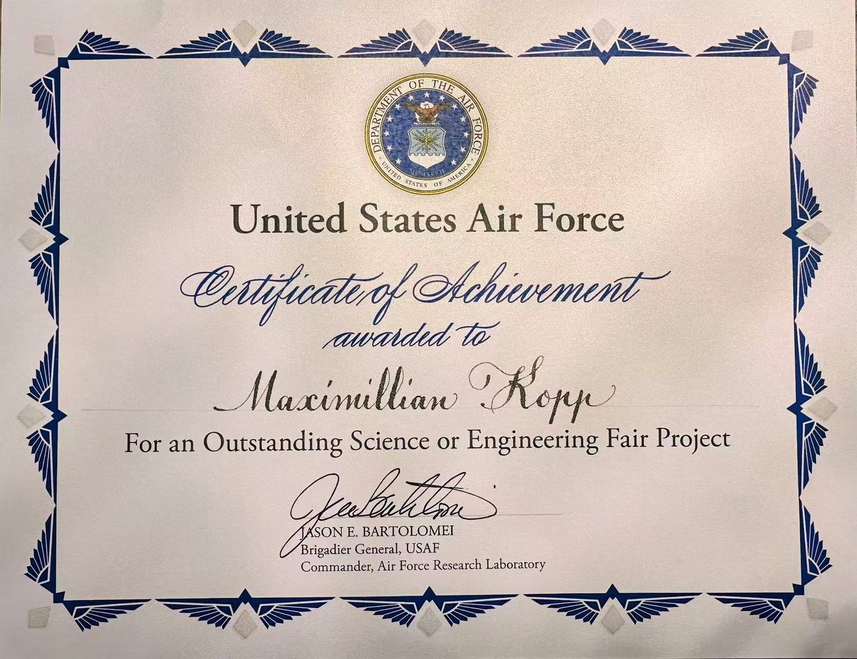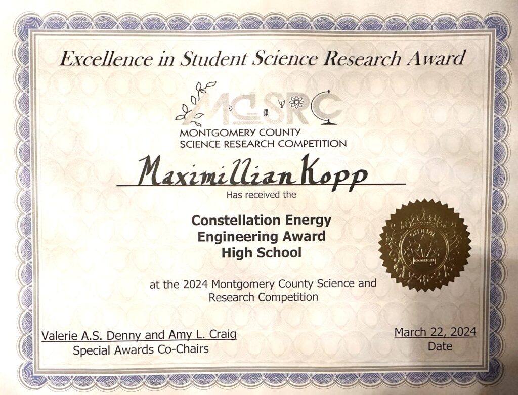 April, 2025, U.S. Air Force Certificate of Achievement in Science & Engineering – Delaware Valley Science Fair (April, 2025) Acknowledges significant contributions to science and engineering projects relevant to the U.S. Air Force’s interests.