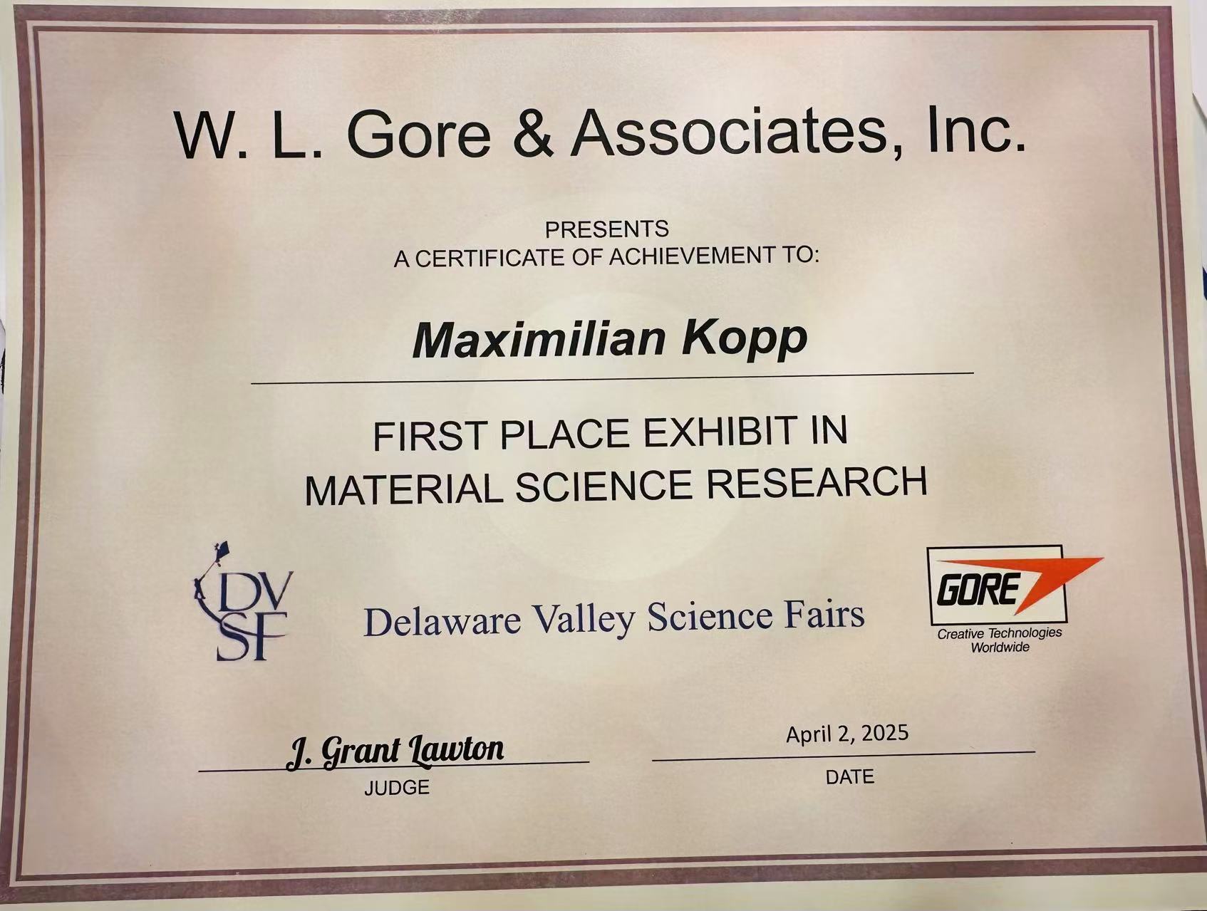 April, 2025, W.L. Gore & Associates Engineering First Award for Material Science Awarded for outstanding research in material science at the Delaware Valley Science Fair.