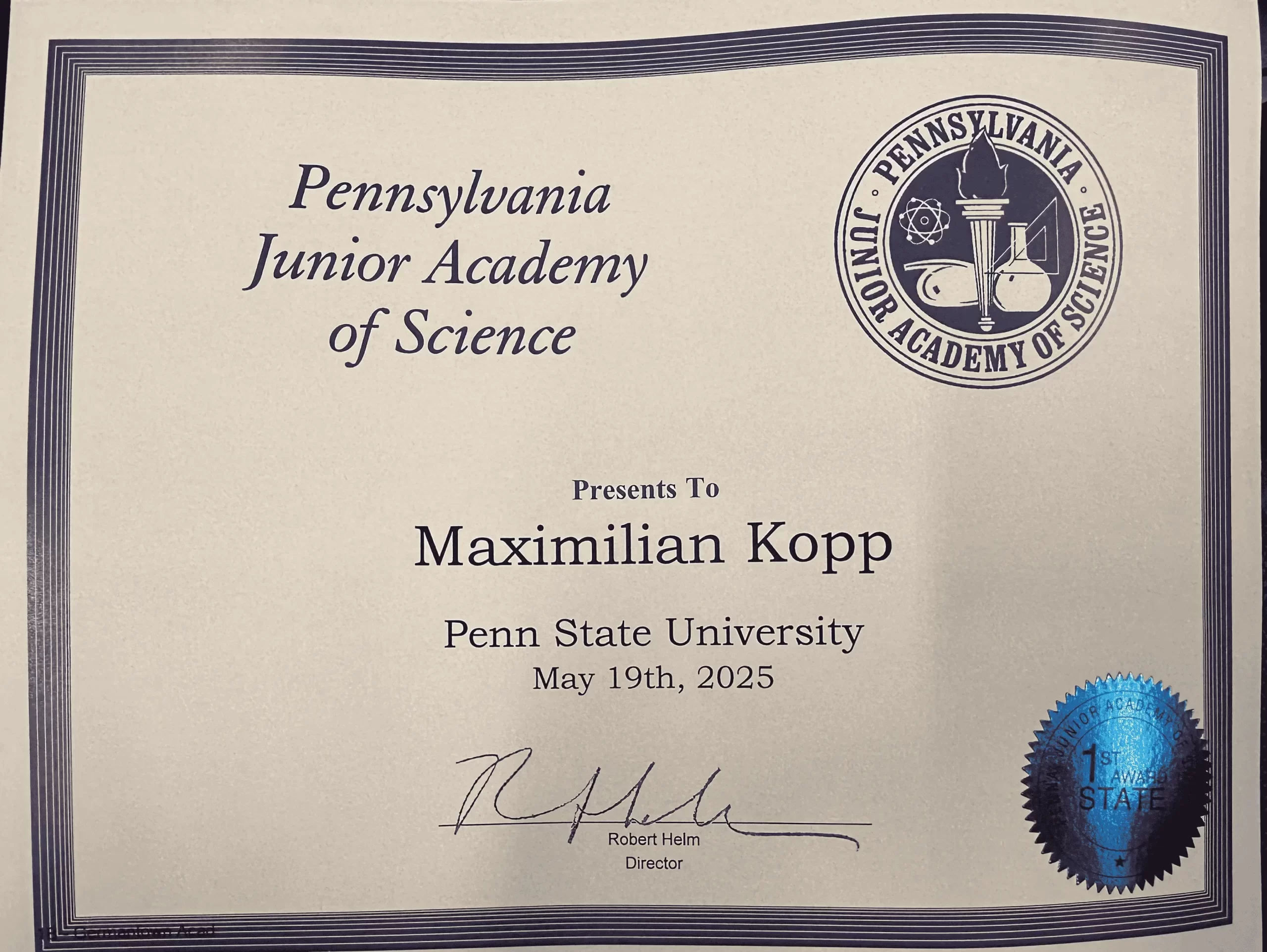 May, 2025, First Award – Pennsylvania Junior Academy of Science (PJAS) State Competition, awarded for excellence in scientific research and presentation at Penn State University, University Park, PA.