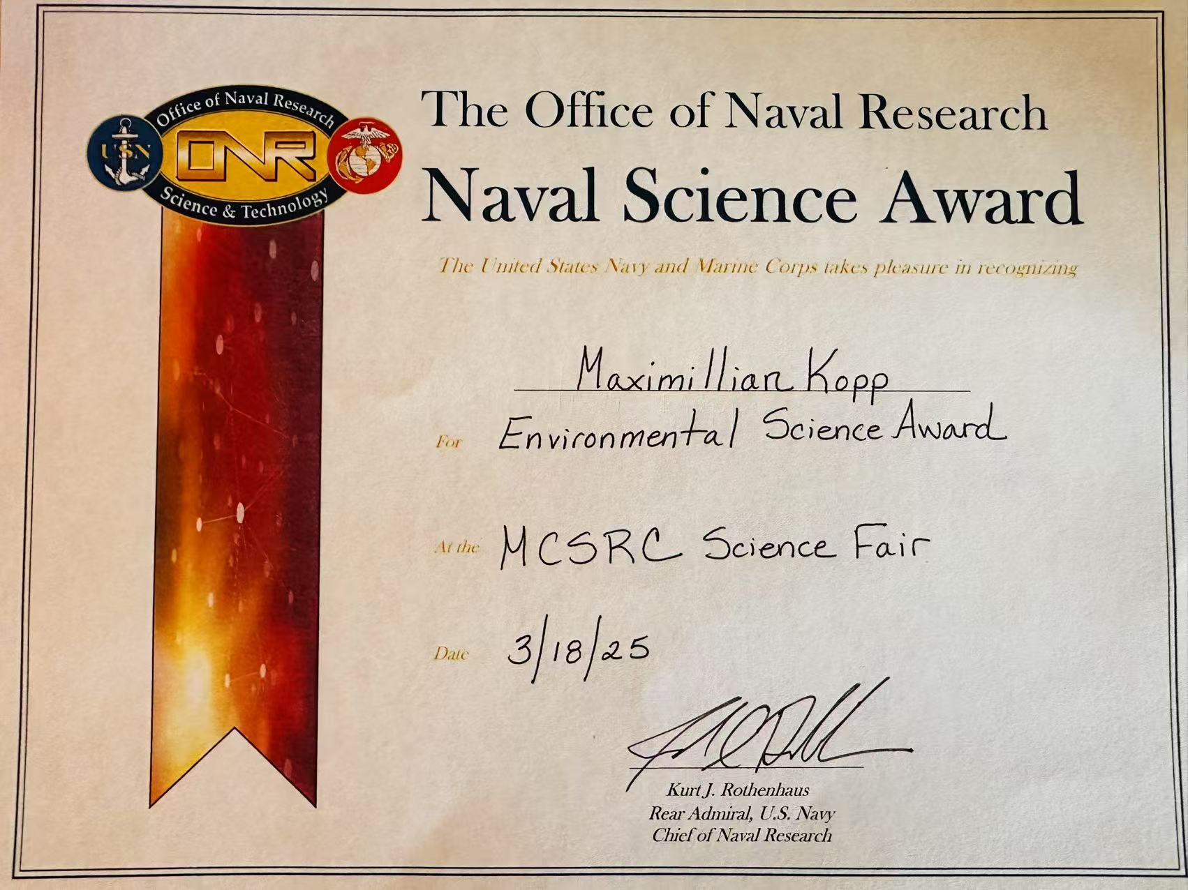 March, 2025,U.S. Navy Environmental Science Award – Montgomery County Science Fair Honors outstanding environmental science projects with potential applications for the U.S. Navy.