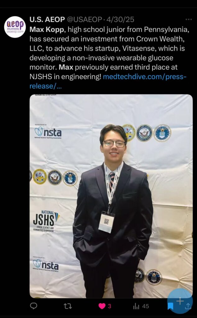 Max Kopp’s work in biomedical innovation and space safety has captured the attention of national media, tech publications, and global thought leaders. His unique combination of youth, scientific rigor, and entrepreneurial drive has made him a sought-after voice in the conversation around next-gen health tech.